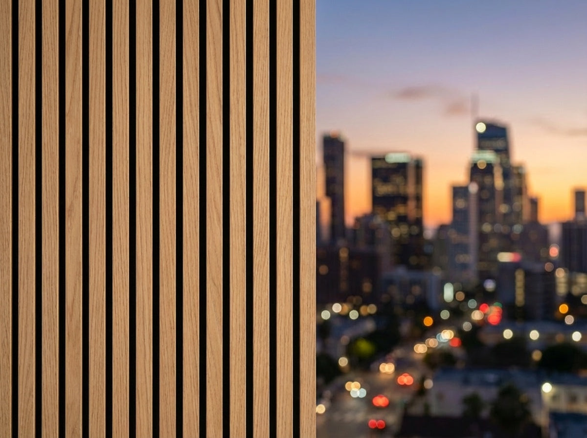 Varje trästav är klädd med fanér på tre sidor – front och båda kanter – vilket ger ett mer genomarbetat och arkitektoniskt uttryck jämfört med traditionella paneler med synliga råkanter.
